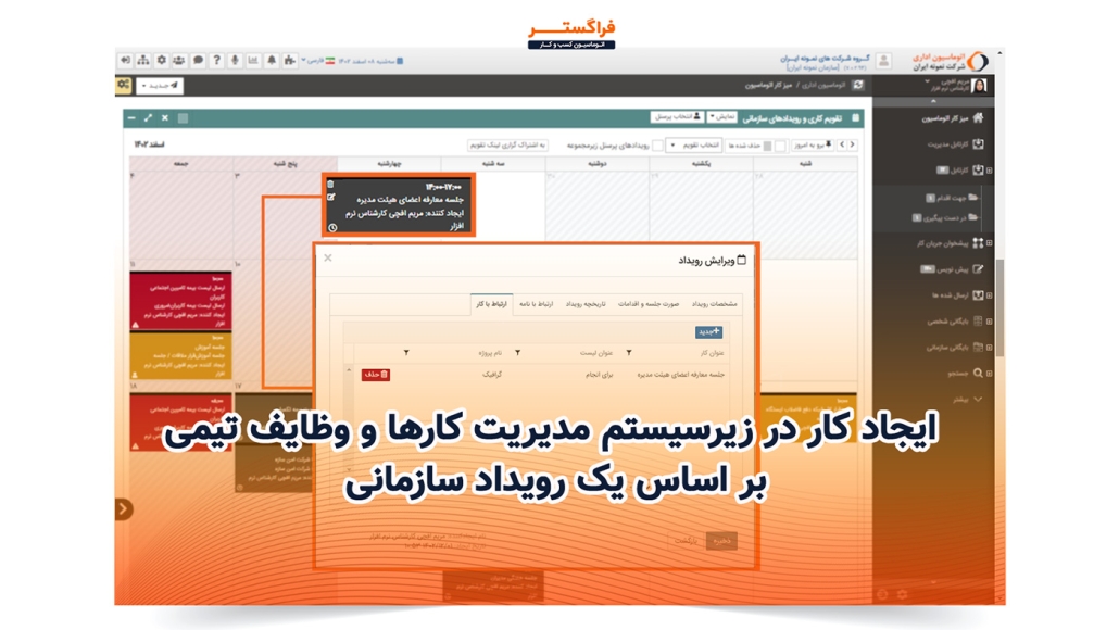 در بسیاری از سازمانها، ممکن است هنگامی که جلسه یا رویدادی برگزار میگردد، کارها و وظایف زیادی تعریف شود و نیاز باشد که این کارها به افراد مختلف، منتسب شود. برای هماهنگی و مدیریت صحیح این کارها شما به سادگی میتوانید، از روی یک جلسه در تقویم سازمانی اتوماسیون فراگستر، کار (یا کارهایی) را در سیستم “مدیریت کارها و وظایف تیمی” ایجاد کنید، با افراد در تعامل باشید و میزان پیشرفت امور را پیگیری نمایید.