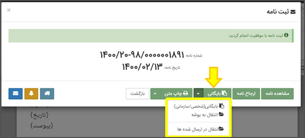 همانطور که در تصویر زیر نمایش داده شده زمانیکه سند دراتوماسیون ثبت می شود، این امکان در فرم شماره اندیکاتور، برای کاربران اضافه شده تا به بایگانی سریع سند، دسترسی راحتتری داشته باشند. تا دیگر برای بایگانی نیاز نباشد سند را از کارتابل یا فرم جستجو و سپس بایگانی کنند.