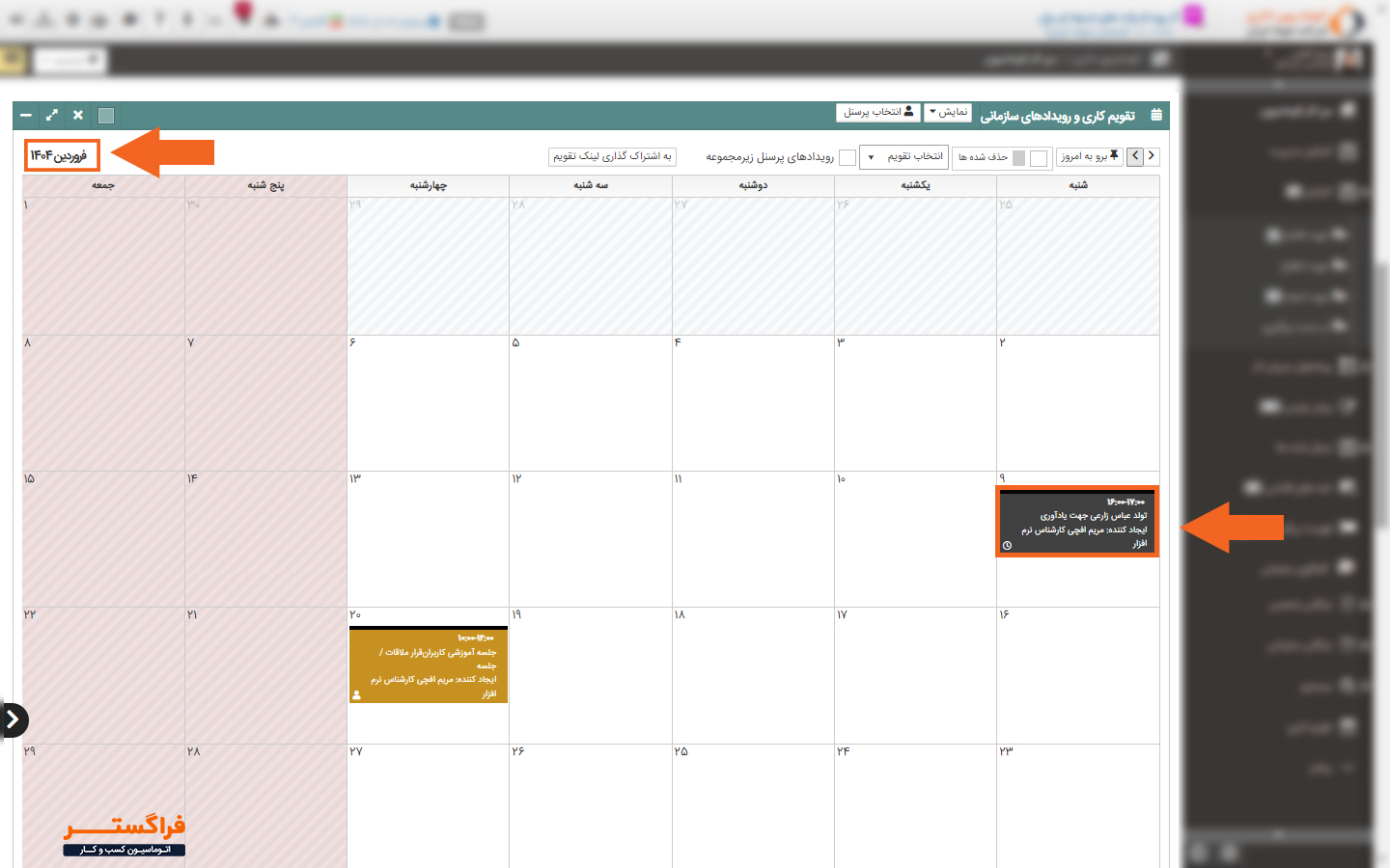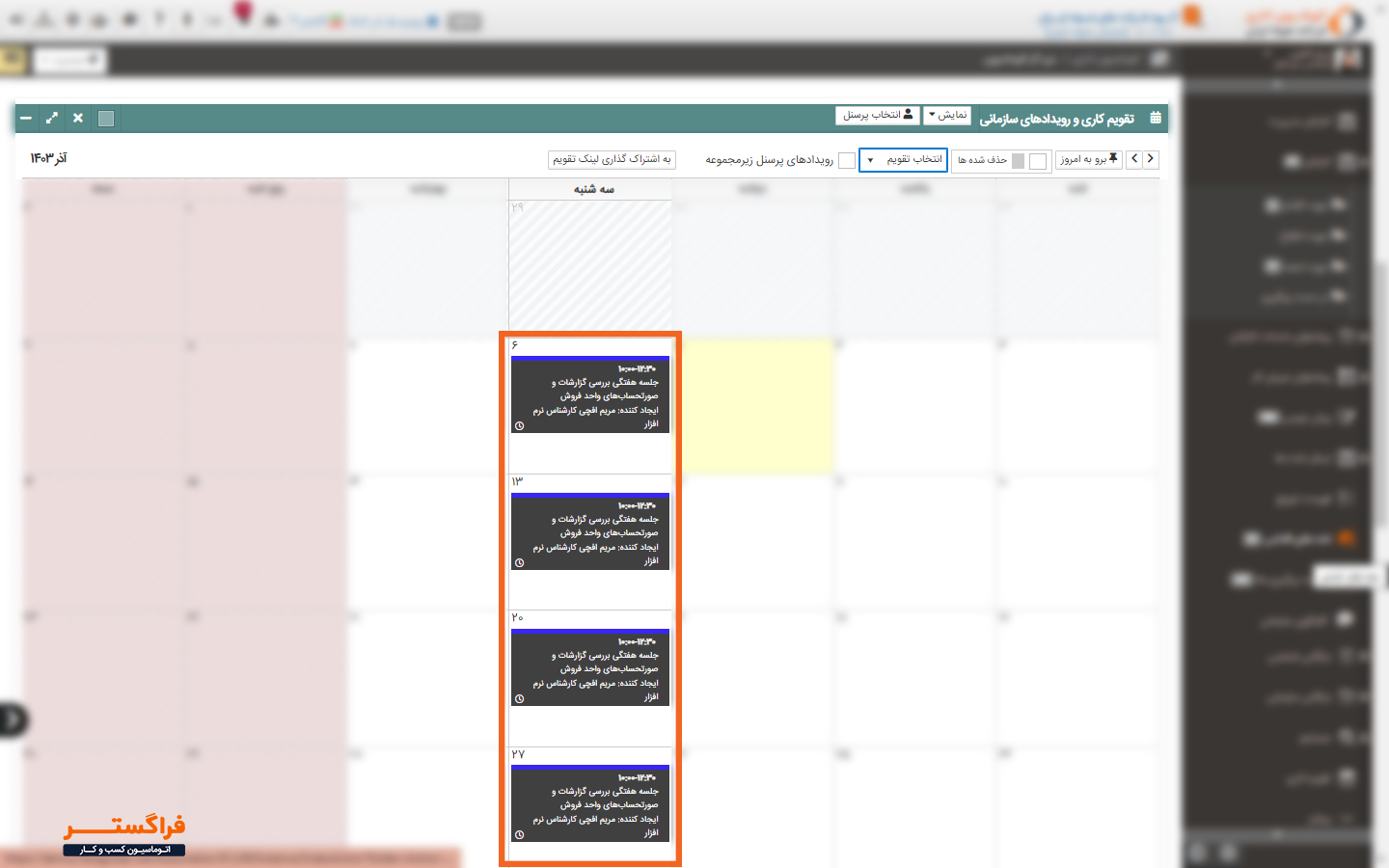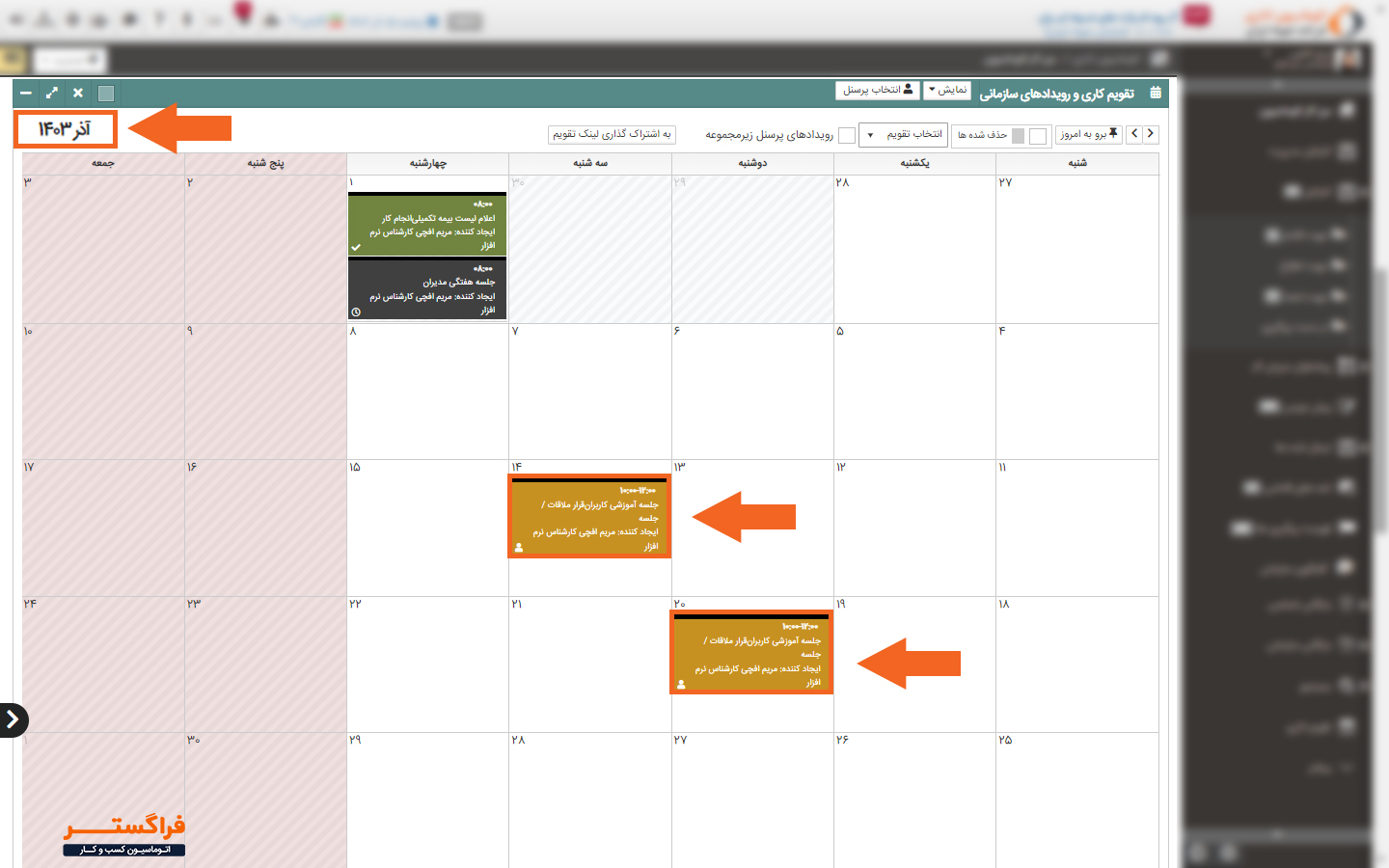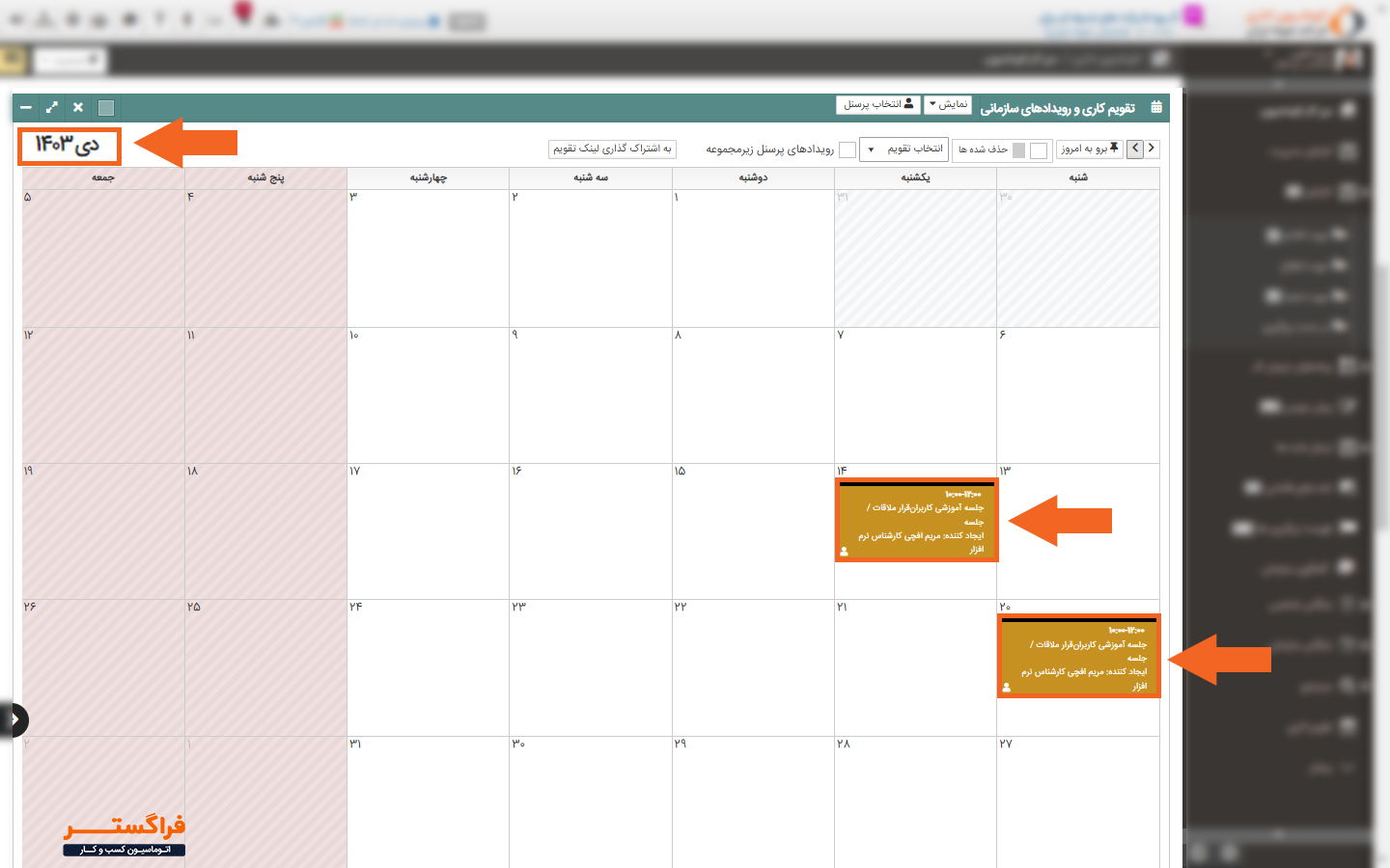 همانطور که مشاهده میکنید، این رویداد در تقویم سازمانی فراگستر برای چهاردهم و بیستم ماه آذر و دی و ماههای دیگر در این بازه زمانی ثبت شده است.