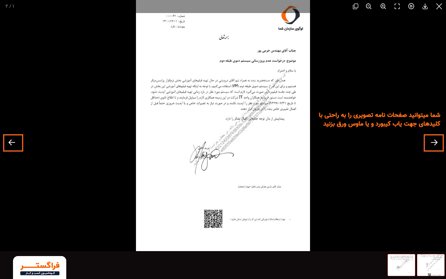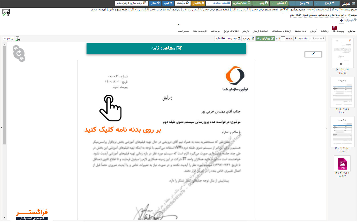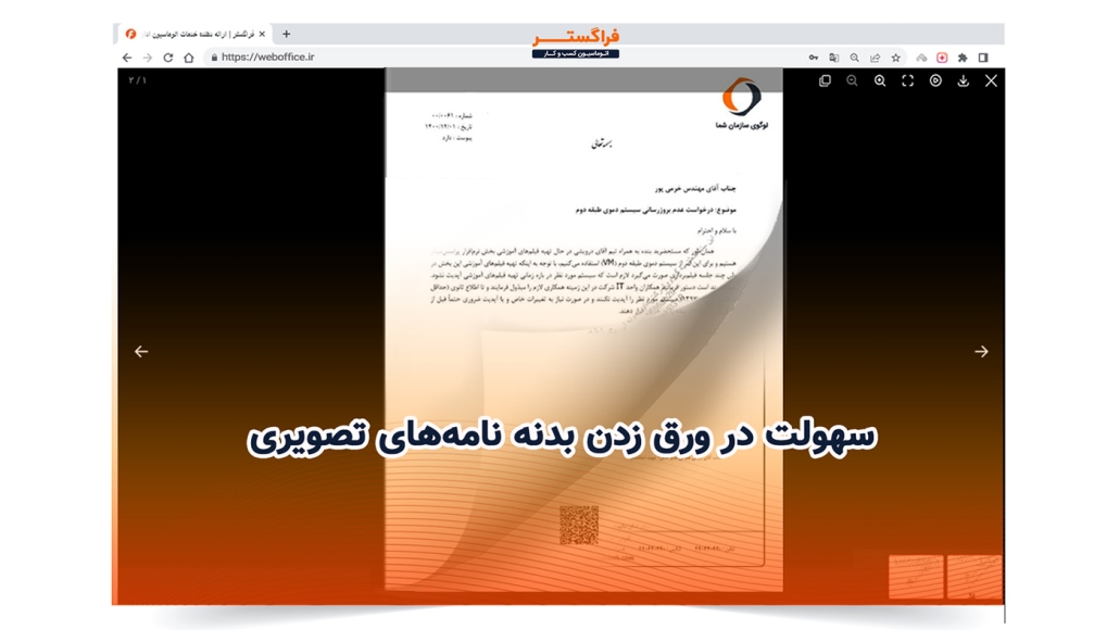 با این قابلیت اتوماسیون کسب و کار فراگستر، هنگامی که بر روی بدنه نامه کلیک کنید، نامه در یک محیط بیرونی برای شما باز خواهد شد و شما میتوانید صفحات نامه را به راحتی با کلیدهای جهت یاب کیبورد و یا ماوس ورق بزنید و برای مشاهده بهتر آن را بزرگ یا کوچک نمایی کنید.