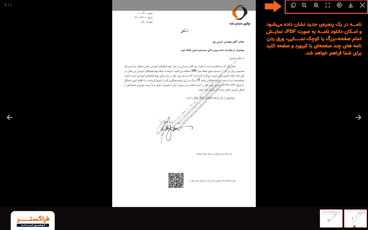 علاوه بر آن امکان دانلود نامه به صورت PDF، نمایش تمام صفحه، بزرگ یا کوچک نمایی نیز برای شما در دسترس است.