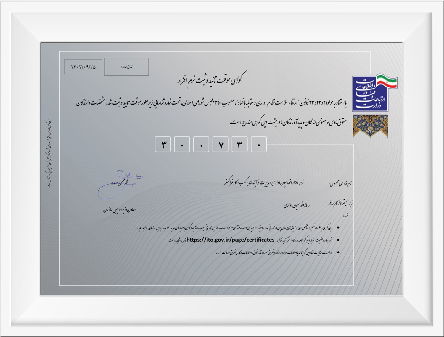 تمدید گواهی سلامت نظام اداری و احراز اصالت نرمافزار اتوماسیون اداری فراگستر