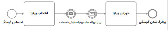 به همین دلیل در مدل بالا از یک وظیفه (سفارش پیتزا) بجای استفاده از یک “throwing intermediate events” استفاده نمودیم. همچنین میتوانیم در مدل بالا از انواع وظیفههای خاص تعریف شده در BPMN برای پیامهای دریافتی و ارسالی استفاده نماییم.