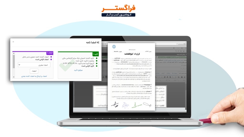 اتوماسیون اداری فراگستر به شما کمک میکند به راحتی اسنادی مانند قراردادها و یا صورتجلسههایتان را با امکان تعریف نامحدود تاییدها و امضاها بصورت امن و سریع در سازمان به گردش درآورید.